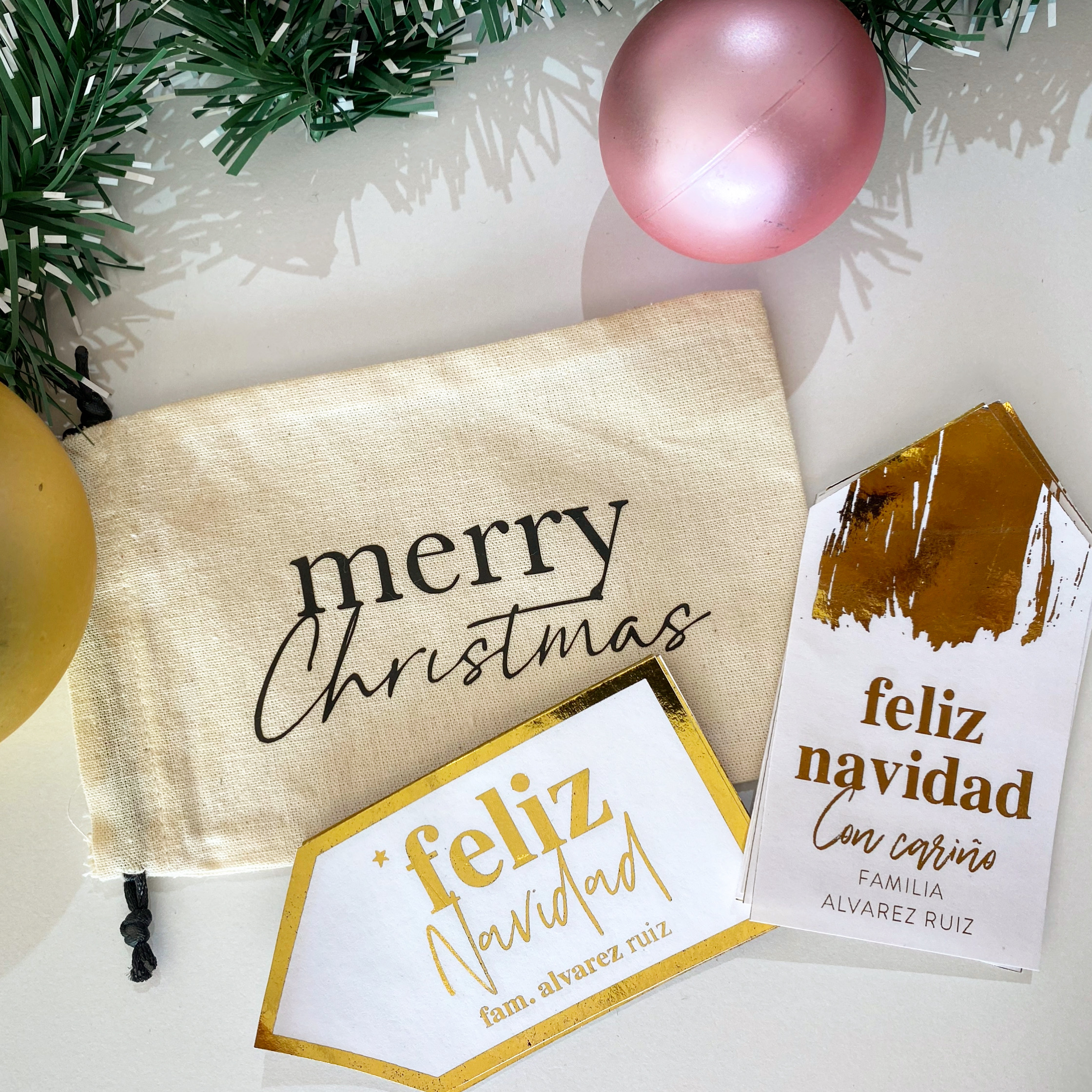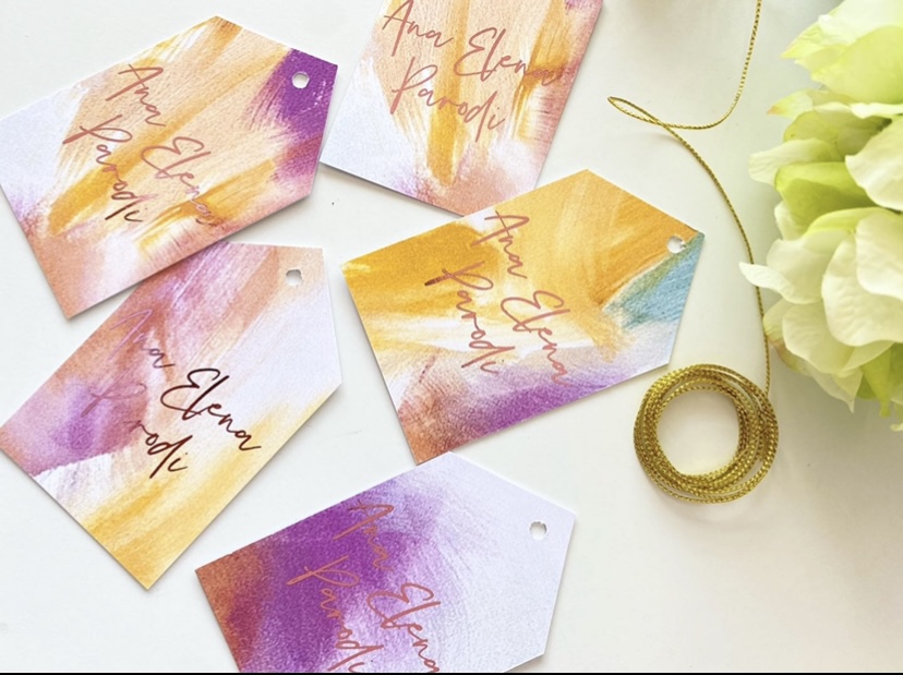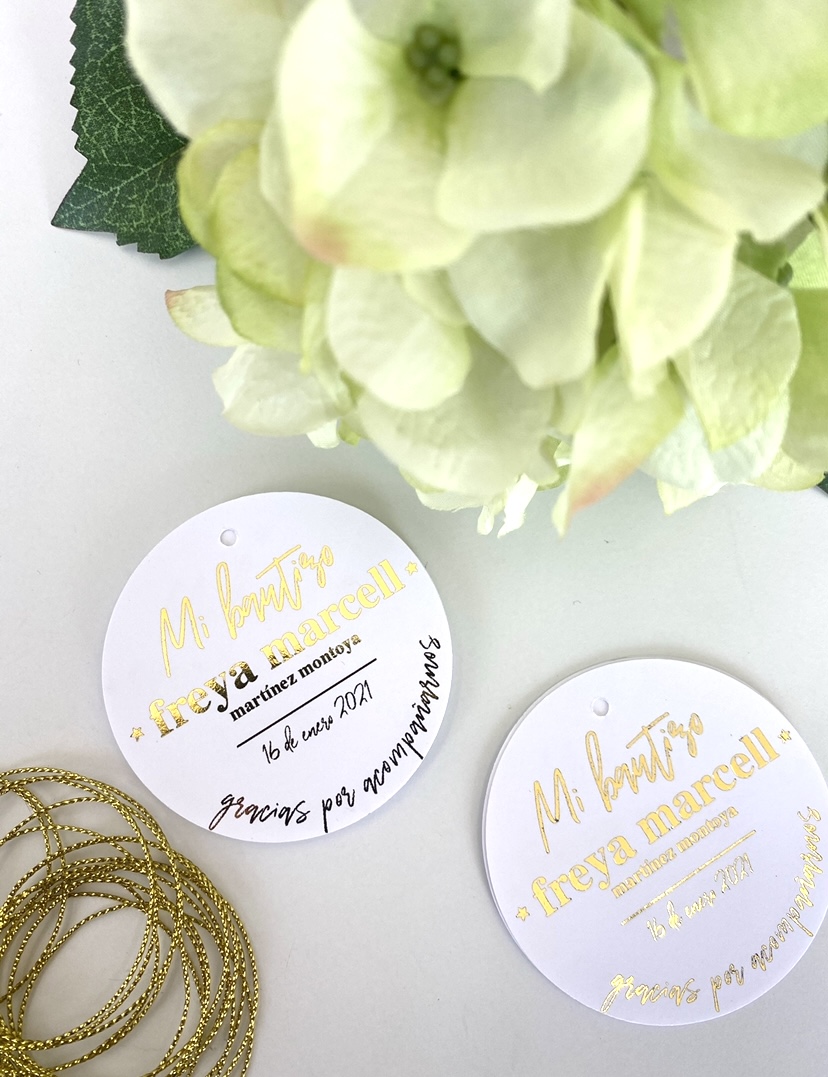 Paquete con 16 Tags personalizadas con tu nombre, en cartulina opalina de 500 gramos con impresión digital y laminado en foil.
